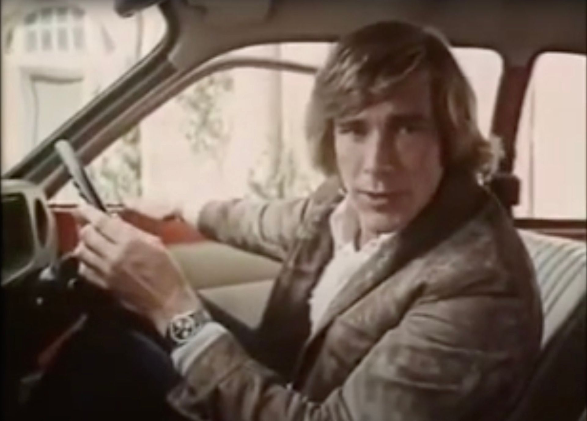 A 1970 advertisement featuring James Hunt wearing a reverse panda Carrera