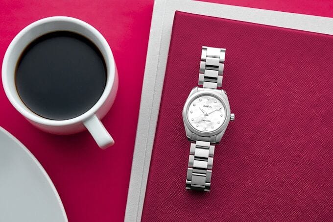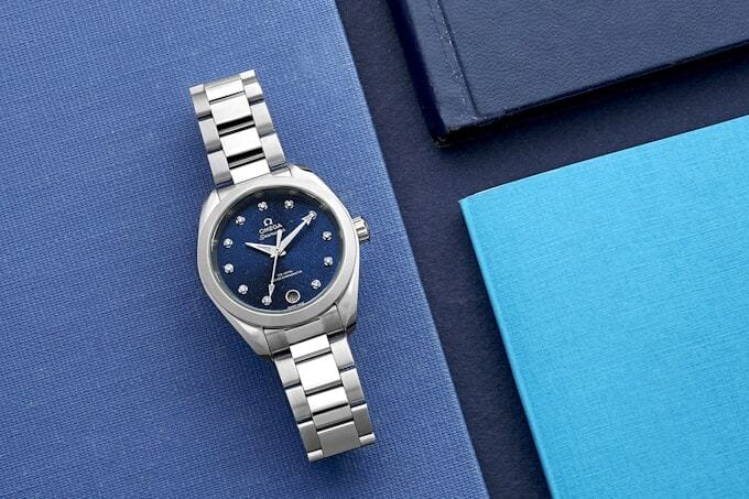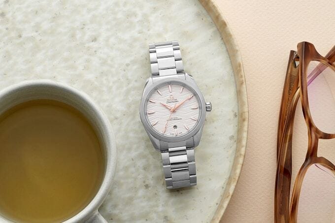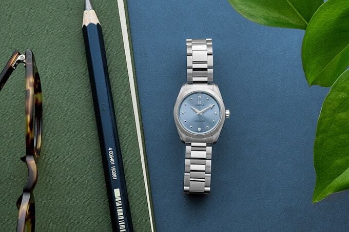 Most of the larger Aqua Terra models share the same teak dial appearance in various color executions, but OMEGA starts experimenting with the Aqua Terra aesthetic once the diameters shrink. There’s still an automatic, Master Chronometer-certified movement ticking inside these smaller and thinner watches – and, yes, they’re still tested to 150 meters of water resistance – but OMEGA swaps out the identifiable horizontal pattern for more resplendent dial designs with a mixture of textures and the addition of precious metals and stones.