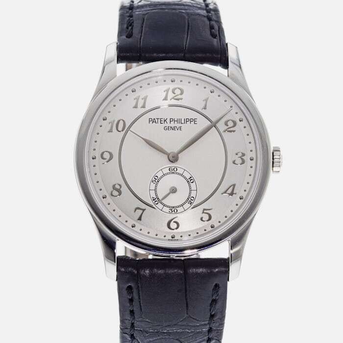 The two-tone silver dial follows in the ethos of the case, featuring a simple small seconds, time-only configuration, but one that’s finely elevated in each of its details. A multi-sector design is the most prominent theme in the style, the applied gold accents like its Breguet numerals adding captivating dimensional contrast. An ever-so-slightly indented sub-dial for the running seconds is balanced against a simple printed logo towards 12 o’clock, a pair of elongated leaf-style hands steadily passing overhead for the hours and minutes. The manually wound Patek Philippe caliber 215PS powers the formal watch with a 44-hour power reserve, and the mechanism’s expert finishing is humbly hidden behind an unadorned, solid platinum caseback, which is all in line with the renowned, understated luxury the Calatrava represents.
