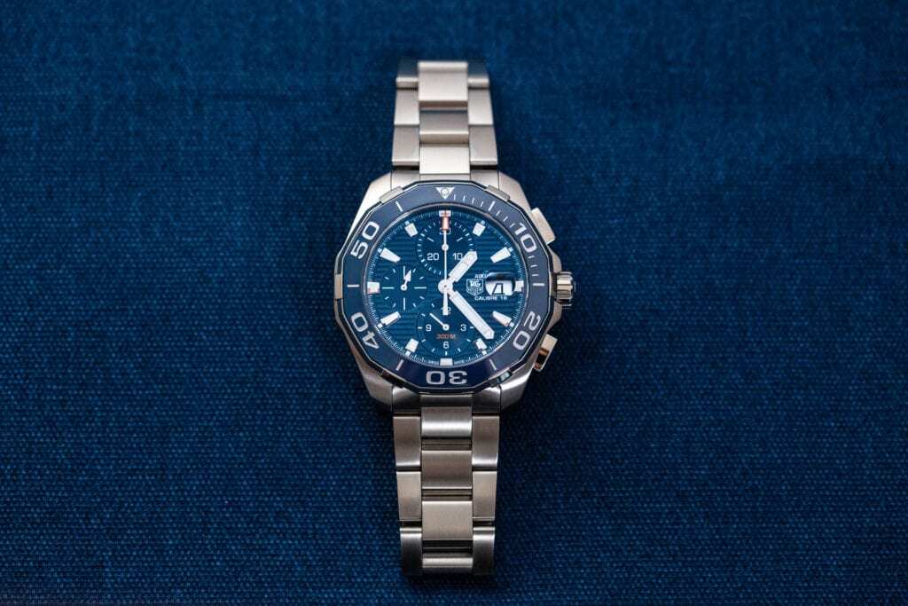 So up next in our TAG Heuer buying guide is our dive watch category. Now TAG Heuer is a brand that is heavily rooted in motorsport but that hasn’t stopped them from producing a dive watch. Actually, TAG Heuer has an entire line that they call that Aquaracer and believe it or not they have over 60 unique models. Yeah 6-0, 60 unique models, which is extremely overwhelming. So, we want to break down what to look out for in the Aquaracer lineup that we call the dive category. So, the two most defining characteristics of an Aquaracer are the screw down crown and the unique 12-sided rotating bezel. Now there are some Aquaracers that have chronographs, but we think if you’re going to go with an Aquaracer that you need to go with one of the classic options.