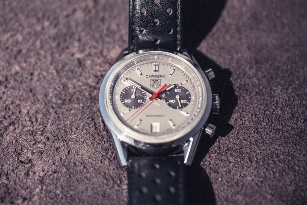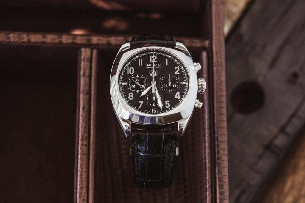 So, we’re going to focus on the Carrera and the Monaco. So, when it comes to some of the dress Carreras we recommend looking at either the time only Carreras like the Calibre 6 or if you want to mix it up a little you can look at the GMT complication called the Calibre 7, The Twin Time. Those are two really good options. They’re sleek designs, they’re simple. Another really cool option is some of the Carrera reissues. Particularly I love the 1964 Reissue of the Carrera and that on the leather strap is gorgeous. You can also occasionally find that in precious metal. So those options, to us, do a better job of creating a sleek dress watch that maintains a lot of that Heuer heritage.
