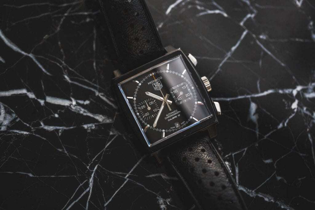 Now the Carrera line is a place where TAG Heuer kind of pushes the envelope technologically. They have actually some in-house movements that end up in some of their watches, but again we think that some of the best Carreras are the reissues. They show off what makes a Carrera so great. So angular lugs, often a more modest wrist size, and very legible clean dials. All right so up next is the Monaco line, and I know that we talked about the Monaco when we were talking about dress watches, but it deserves mentioning again. The Monaco was released in the late 60s and it was a showstopper. I mean this thing was crazy and that design has withstood the test of time. It is still here today, and you can still get a TAG Heuer Monaco with a crown at nine o’clock, albeit not the original movement rather a reproduction of it but it is a phenomenal watch.