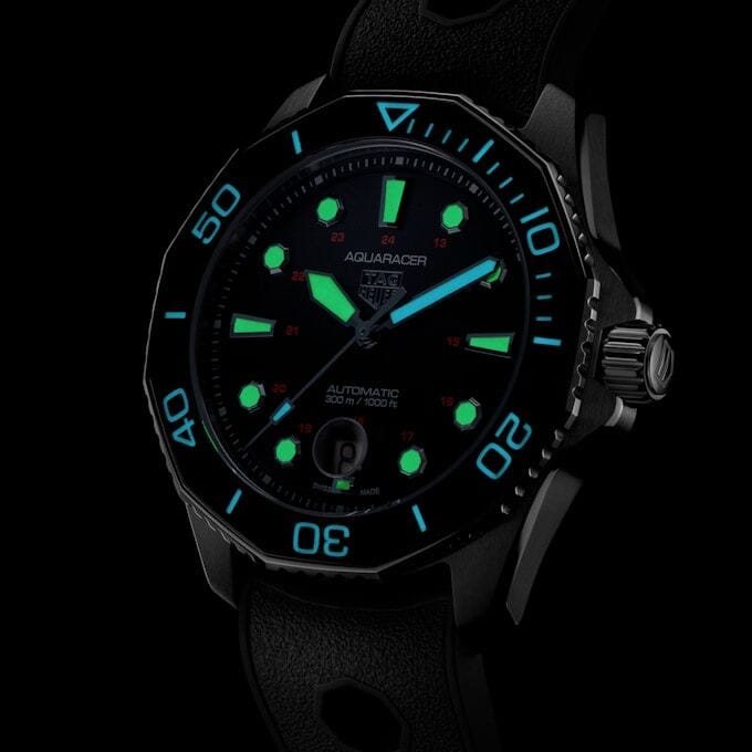 One rather obvious deviation that the Aquaracer Pro 300 makes from standard dive watches is the magnification lens over the date window at six o’clock. Dive watches with the date and lens at three-o’clock are ubiquitous, so hats off to TAG Heuer for finding a simple, elegant, symmetrical way out of the ubiquity. Another unique approach is the 12-sided bezel. Technically a dodecagon, the subtle angles of the bezel’s outer edge distinguish the Aquaracer Pro 300, and we especially love the way TAG’s designers have incorporated the knurling onto those twelve surfaces.