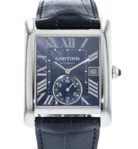 The Tank is undeniably one of Cartier’s most distinctive and iconic watches. In 2013, the classic model got an upgrade with the introduction of the Tank MC, which stands for “Manufacture Cartier.” As the name indicates, it comes equipped with an in-house caliber 1904-OS MC automatic movement. Another striking feature is the guilloche dial, for which Cartier is famous. This blue version with a matching blue leather strap is particularly attractive for fall.