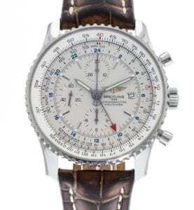 Today, the Navitimer is one of Breitling’s most instantly recognizable and highly sought after models. This iconic pilot’s watch has superb craftsmanship from the inside out, with Breitling’s signature oversized case design. The Navitimer World offers increased functionality to the original line. It houses the brand’s caliber 24 self-winding mechanical movement, which also features a dual time zone system. On a leather strap, this model will make traveling easy this fall.