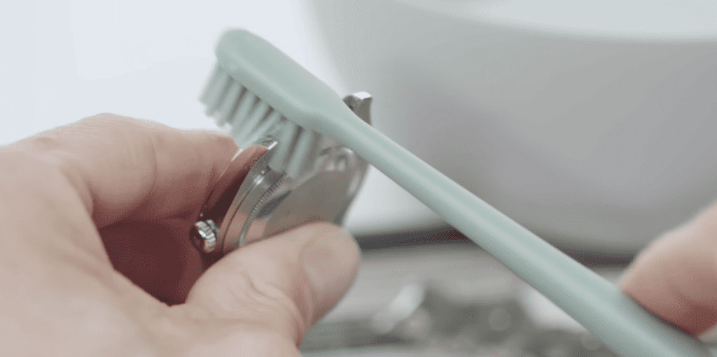 NATHAN: Yeah! But I would say I think for me I clean it probably every six months and usually that’s probably when I’m making like a big like I may take the bracelet off in the summer and give it a big clean and what I usually do is I just set out a towel like next on my kitchen counter and have like a bowl of warm water and an old toothbrush that’s only been used for that.