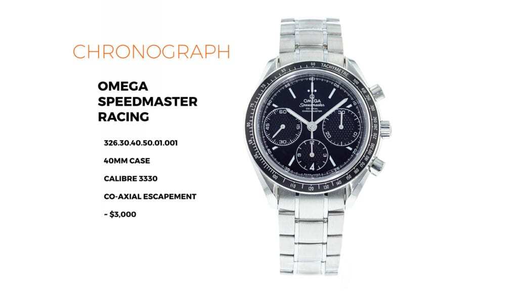 NATHAN: Those are 39 and those are… Those are… They have the module on top. So, the I think it’s the Omega caliber 3330 has fully integrated chronograph movement and it has a coaxial escapement. Like that is a killer movement but I think because the Speedmaster is so… Such a historical piece like if it doesn’t look like the normal Speedmaster people don’t necessarily like it as much, but I think it… Yeah Omega Speedmaster Racing. It’s that. I’ll do some research and I’ll make sure to put it in the description. But those watches may not be under $2000 but I think as far as chronographs go, like you have an automatic chronograph movement, like and it’s from Omega, it’s a solid movement. Like those watches are great. It’s 40-millimeter, like checks a lot of boxes. May not be the quintessential Omega Speedmaster but full stop that’s what I’m going to say.
