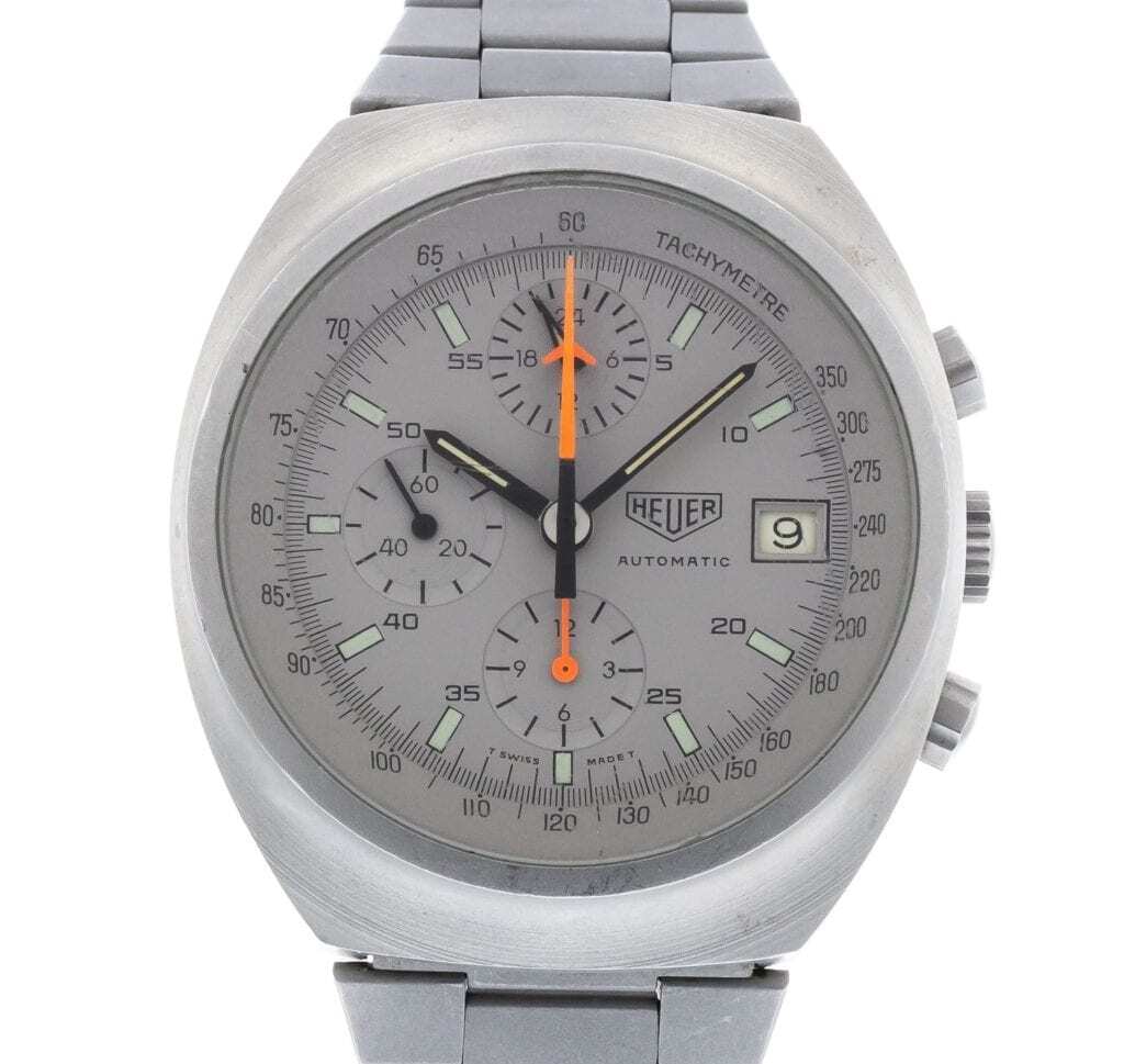 The relationship between Heuer and Lemania is an interesting partnership that spurred in the 1980s. The 1500 series first launched in 1982 and replaced the previous Valjoux movement with the Lemania 5100 chronograph. The model in our inventory, 510.503, showcases a few unique features. The simple date function, as opposed to day-date, indicates it’s a first series model. Another unique attribute is the pewter design. The line offered three stylistic options: classic stainless steel, PVD, and pewter. The pewter variation creates a distinct monochromatic look that’s simply one-of-a-kind. The bright, contrasting orange chronograph hands pop against the pewter background and give the model a handsome, sporty style.