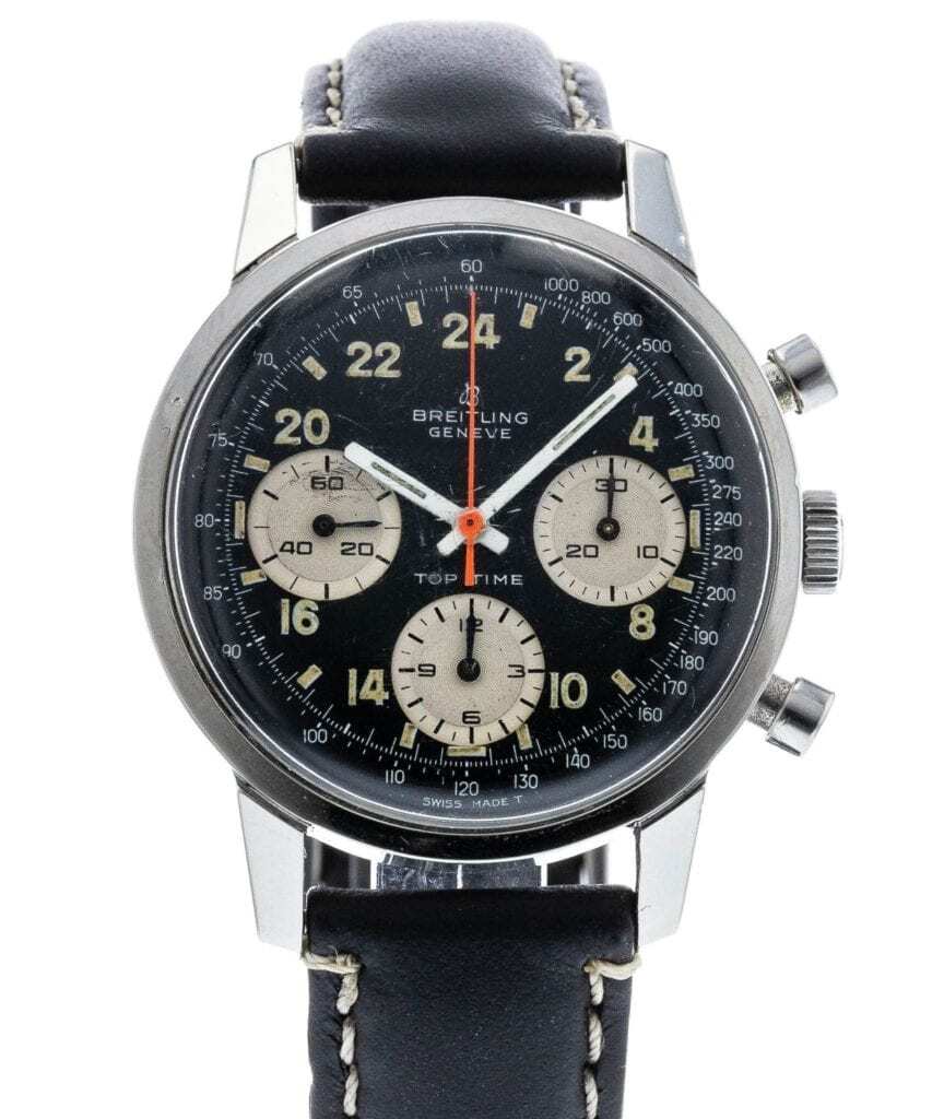 Last but not least in our round up of vintage hidden gems in our inventory is the Breitling Top Time 824. The brand first released the Top Time in 1964 as an entry-level chronograph. However, the model soon gained celebrity status and widespread popularity. For instance, Sean Connery sported the watch in the James Bond film Thunderball a year after its debut in 1965. One of the most notable and desirable aspects of this particular reference is the iconic reverse panda dial. Breitling was the first to introduce this style on the SuperOcean in 1957. It quickly became a favorite for its one-of-a-kind look and practical, easy legibility.