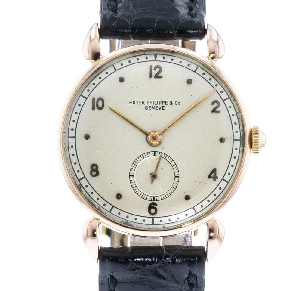 The Calatrava is Patek Philippe’s flagship model, first introduced in 1932. Similar to the Ultra-Chron, it’s a classic dress watch with a minimalist, no-frills, time-only design. The model in our catalog hails from a few decades after the initial Calatrava debuted. The Reference 1509 first launched in the 1940s, and our particular model dates to the 1950s. This reference is most notable for its distinctive teardrop lugs. However, its design also marks the transition to the 2500 series of the model in the 1950s. The 2500 references feature the unique “Disco Volante” or “flying saucer” case style. Here, the crown rests inside the outer circular portion that lines up with the raised bezel.