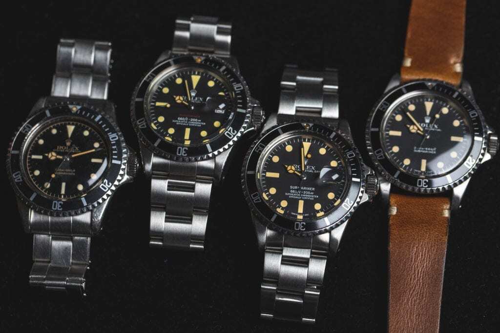 He also has a couple of 1680 Submariners. They are from the 1970’s and have the date window. Both of them have a creamy and even patina. One version also has the red writing on the dial. Plus, they both have the original stickers on the back. The green and gold is faded, but the Rolex crown is distinct.