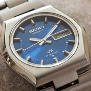 This is a 1973 Seiko Lord Matic, and it is the watch that started it all for me. Back in the 1970s my dad was starting to get into watches, but getting a fancy Japanese watch was a pretty tall order. This is because my family was from the Soviet Union, were there were not a lot of imported products. Thus having a Seiko or an Orient was The Ultimate Prize. The only way you could go about getting such a prize was if you were important enough to be allowed to travel outside the country, or if you knew someone who knew someone who knew someone. That someone my dad knew was a friend who worked in a consignment store. He asked her to let him know if anyone ever brought in one of these coveted watches. Six months later he got a call. Apparently some important athlete had been traveling in the United Arab Emirates and picked up this little blue Seiko (the day wheel was in English and Arabic). With little hesitation my dad spent one month salary to have it on his wrist. To this day I can remember watching him walking around the apartment in the morning shaking the watch back and forth to wind it with the automatic mechanism. When he turned 50, half a world away in the United States, he received his first Swiss watch from my mother and passed the little blue Seiko on to me. Last year he got nostalgic and asked if you could have it back for a little while and thus it is now back on it’s an original wrist.