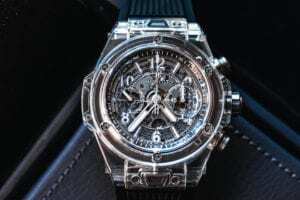Last up is the Hublot Big Bang Unico Sapphire. This is ridiculous in all the right ways. Kind of like a chrome Lamborghini. You can’t help but admire it for all that it is. This watch is cut from sapphire. The same material that your crystal is often made from; a material that’s also known for being harder than ceramic is definitely going to be a challenge to work with. The additional parts on the watch are made from titanium. As with most watches on this list the high-tech case wasn’t enough, and with the movement Hublot decided to dial this watch up to 11. The movement is a skeletonized, automatic, column wheel flyback, chronograph, and to take it even further many of the parts on the dial are made of transparent resin. The best part of this watch is the visible column wheel at 6 o’clock on the skeletonized dial.