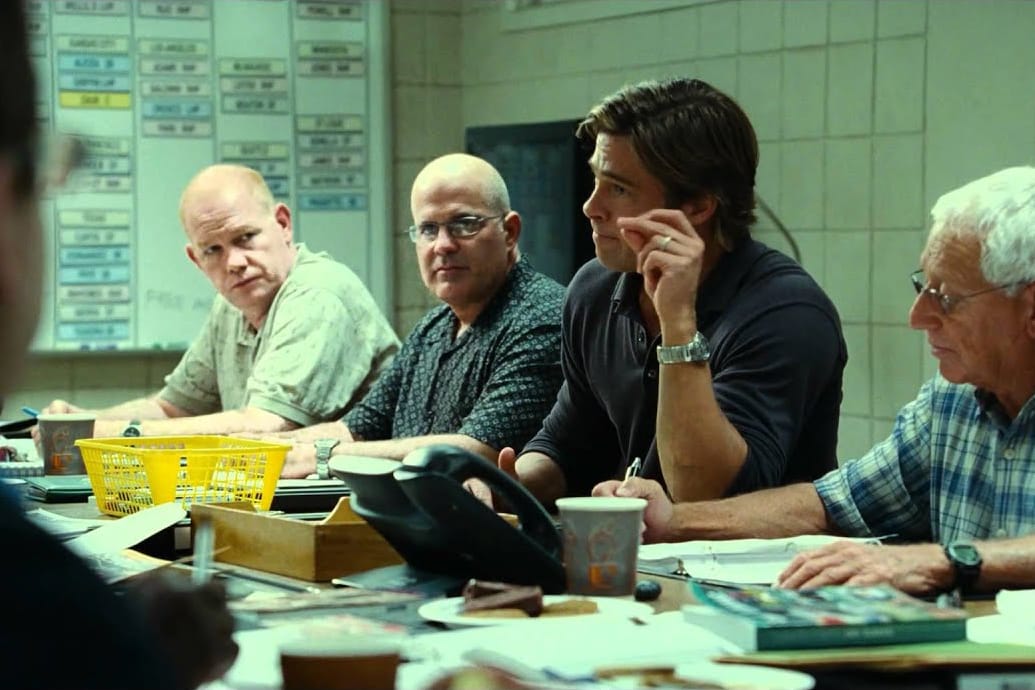 Billy Beane (Brad Pitt) quizzing his scouts and wearing his TAG in Moneyball. Screengrab courtesy: Sony Pictures Entertainment