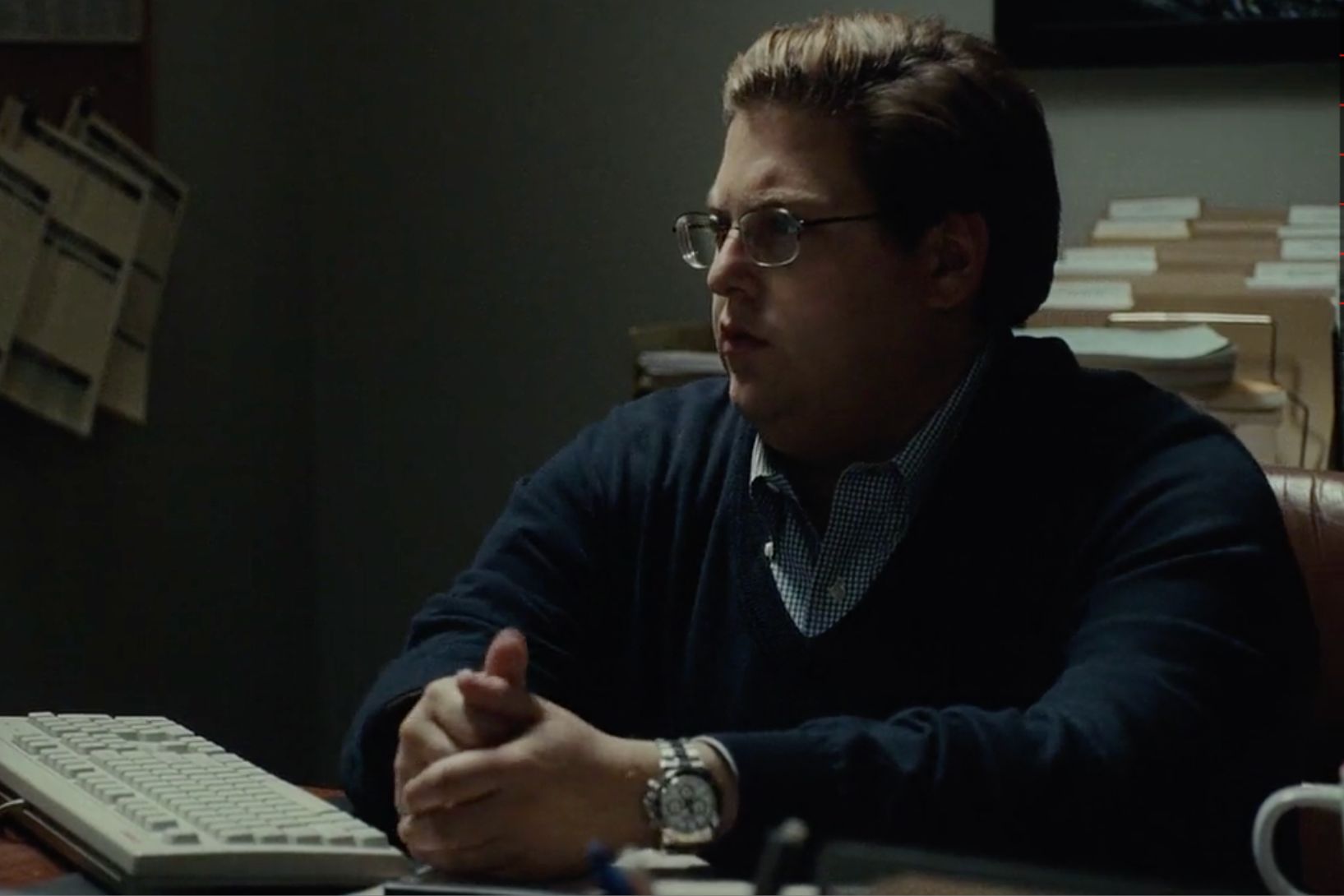 There’s a cool montage, early in the film, of Beane and Brand researching how best to assemble their analytics-forward, budget-friendly roster. Sounds of computer mouse clicks, and ambient music swell in the mix, as pages of player information and statistics flash on the screen. The film then makes a hard cut to Brand sitting at his computer [00:28:54] showing how unromantic, and un-montagey this process is in real life. As he operates the computer, staring blankly at the monitor, his arm rests on the desk of his dark windowless office, showing the white dial and shiny center links of this Rolex Cosmograph Daytona. End montage.