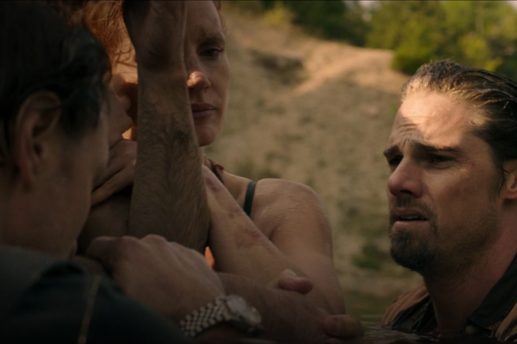This is a long movie (as in over two-and-a-half hours long) so please excuse this jump to the ending. After all manner of spooky and murderous encounters with their face-painted foe, the self-proclaimed “Losers” (the nickname the group of kids gave themselves at the beginning of their friendship) finally take down Pennywise, whose face ballooned to the size of a blimp shortly before meeting his doom. To celebrate, they all go for a swim in the quarry, a setting packed with memories for them. As McAvoy emerges from the water [02:36:57], the camera settles on his wrist in the foreground and we get a nice (though slightly out of focus) closeup of his Datejust. One thing is for sure, he is using the Oyster case as it should be used, and proving the watch worthy of its 100m depth rating.