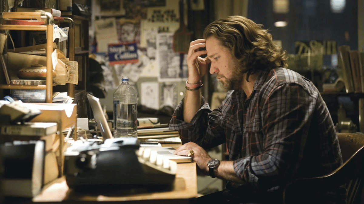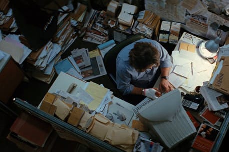 Russell Crowe, as Cal McAffrey, typing away in his messy cubicle in State of Play. Screengrab courtesy: Universal Pictures.