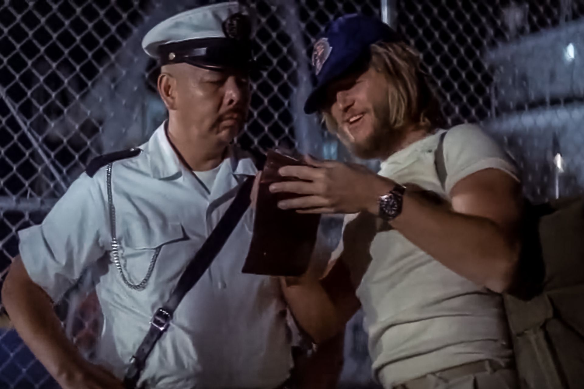 The movie opens at a shipping dock in Indonesia. The camera introduces us to a seedy bunch of characters ready to head into the open water. On cue (0:01:36), The Dude himself stumbles out of a taxi cab with an era-appropriate tight-fitting tee on his torso – and the Submariner prominently on wrist. He proceeds to bribe the security guard and sneak onto the ship, where his adventure begins.