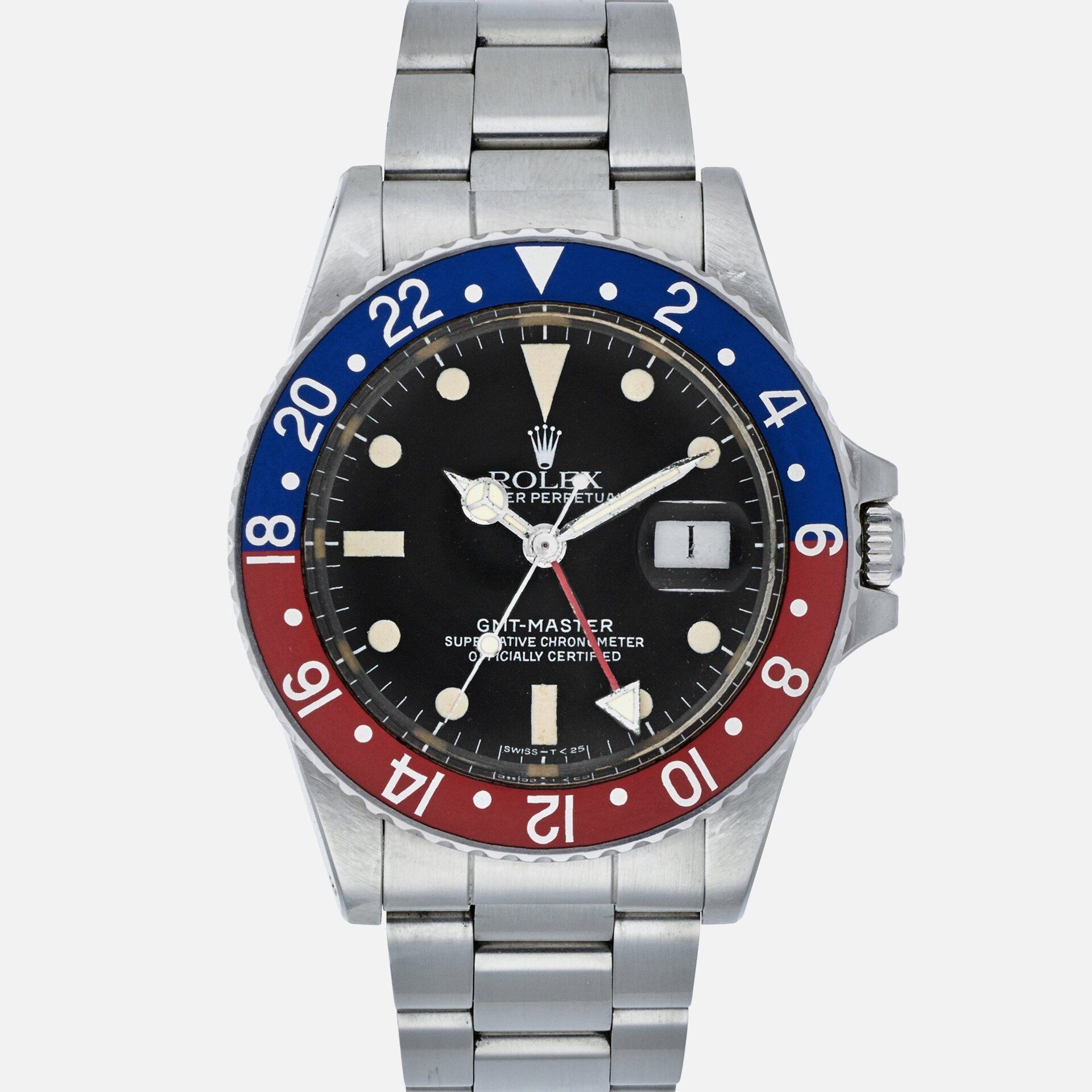 Two details that illustrate why this is a GMT-Master 16750: The crown guards and the order of the dial hands. As Jon Bues and Eric Wind pointed out in the Reference Points on the GMT-Master, the 16750 has the 24-hour hand positioned between the hour and minute hand. On the 1675, that 24-hour hand is on the bottom i.e. closest to the dial. Next, the 16750 has unique crown guards (in the matte dial variants at least) that differ greatly from any other GMT-Master reference. They are significantly taller and rise above the crown. On the 1675, the crown takes a more prominent position and the crown guards are much shorter.