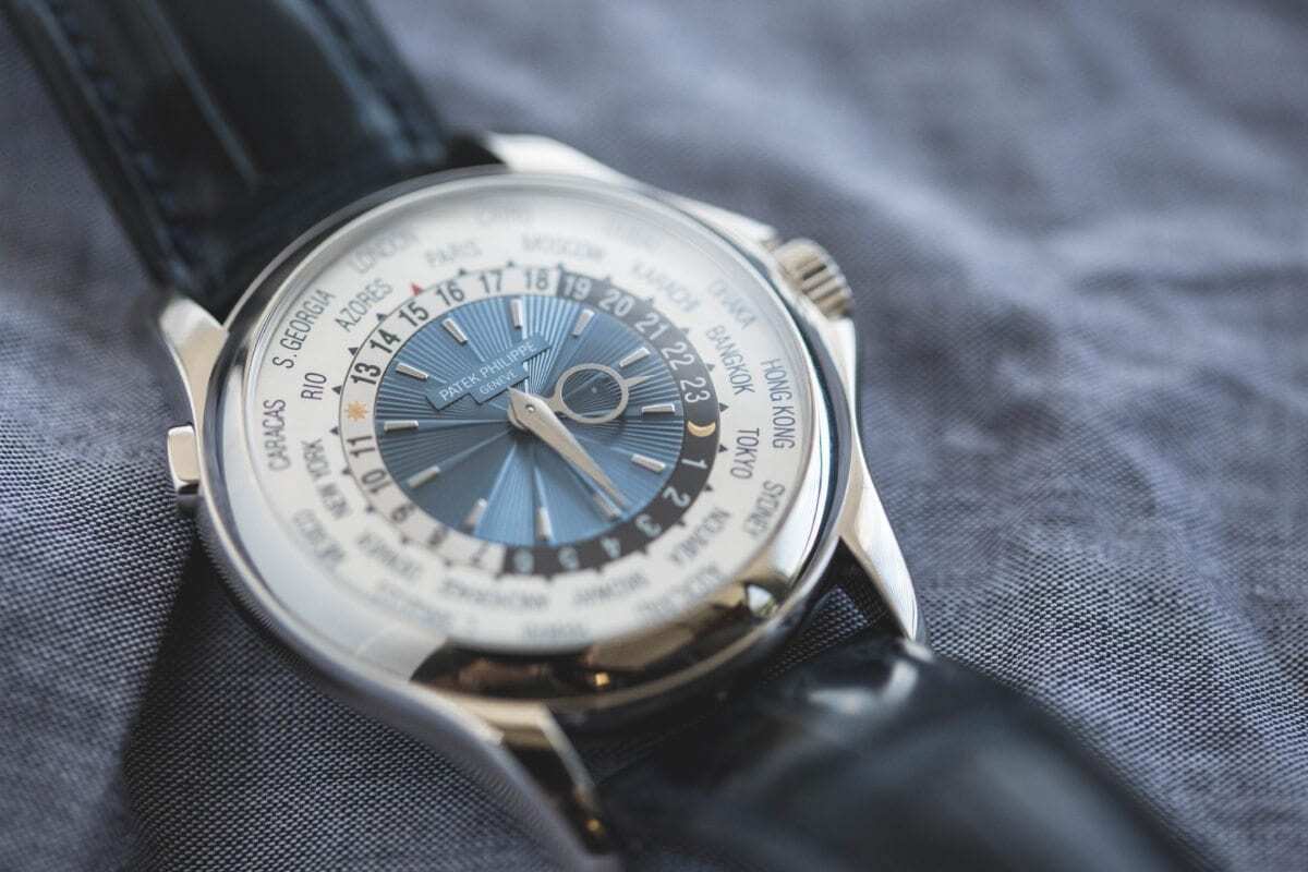 To give you a brief history, the world time complication was invented in the 1930s by an independent watchmaker named Cottier, who gave out his design to a number of watch companies, most notably Patek Philippe. Typically, a worldtimer watch shows the time in 24 time zones simultaneously. The hour and minute hand are coordinated with an outer dial ring listing 24 reference cities for each time zone. Generally, a pusher set into the case allows you to move the chapter ring one city at a time and the hour hand will automatically jump an hour ahead or behind to show the local time in the reference city. At the same time, a rotating 2-hour inner ring turns once per day and shows the time in the other cities on the dial.