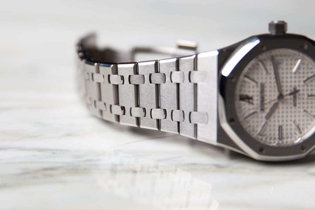 The silver-toned dial, with what AP describes as their “Grande Tapisserie” pattern, has white gold applied hour-markers. The iconic bracelet features a stainless steel construction. Moreover, AP has brushed it to a level of finishing only a brand in the holy trinity of watchmaking can do. The folding clasp locks the timepiece to your wrist with a reassuring click. This bracelet design doesn’t allow for any micro-adjustments. However, with daily wear, it only felt slightly uncomfortable once in three weeks. Flipping the watch over reveals the display caseback, which shows AP’s self-winding Manufacture Calibre 3120. It boasts a power reserve of 60 hours and a monobloc oscillating weight in 22-karat gold.
